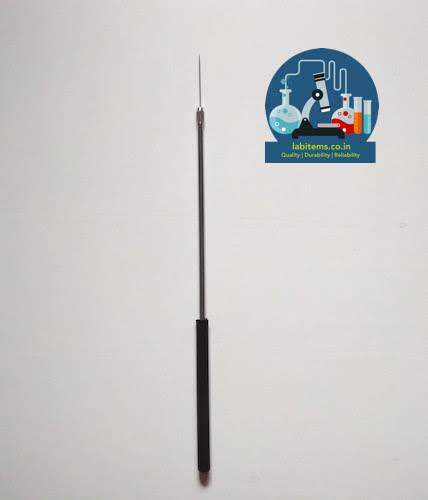 Insect needle for handling insects while dissection or preservation. The sharp tips with varying lengths (5cm or 2.5cm) serve different needs. The metallic head and handle offer exceptional control while handing sensitive insects compared to the plastic needles. The needles are changeable and each insect needle holder comes with 2 no's each 5cm and 2.5cm needles.