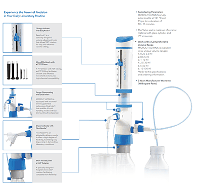 MICROLIT ULTIMUS is a Bottle Top Dispenser (BTD) that works on Dual Inlet Technology®. It offers a sophisticated blend of features and functionality, along with four modes of operation.