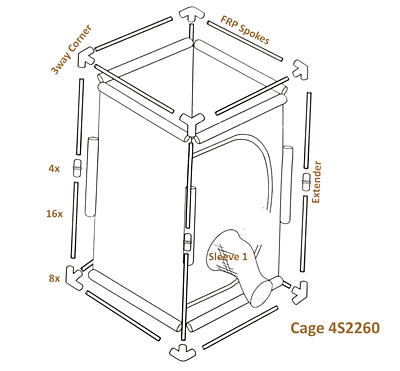 1 Cage | 8 short and 8 long poles | 4 two-way and 8 three-way black connectors