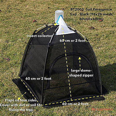 This lightweight soil emergence trap is a small version of our amphibious emergence traps. It has flaps around the base that can be covered with soil to keep the insects inside. Loops at four corners are for the tent pegs (not included) needed in wind.