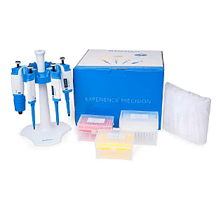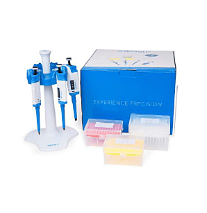 The Micropipette Starter Kit, Set of Three Micropipettes (RBO) offers a versatile solution for laboratories requiring multiple adjustable volume pipettes alongside compatible accessories and a convenient stand.